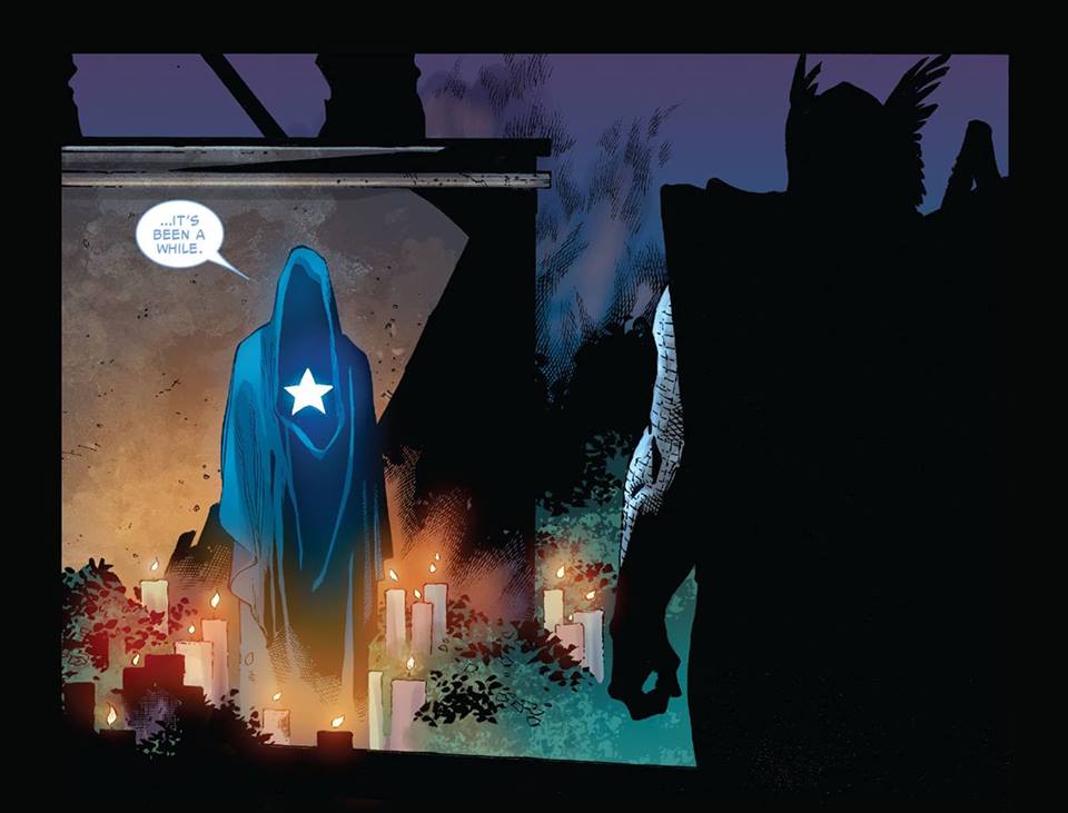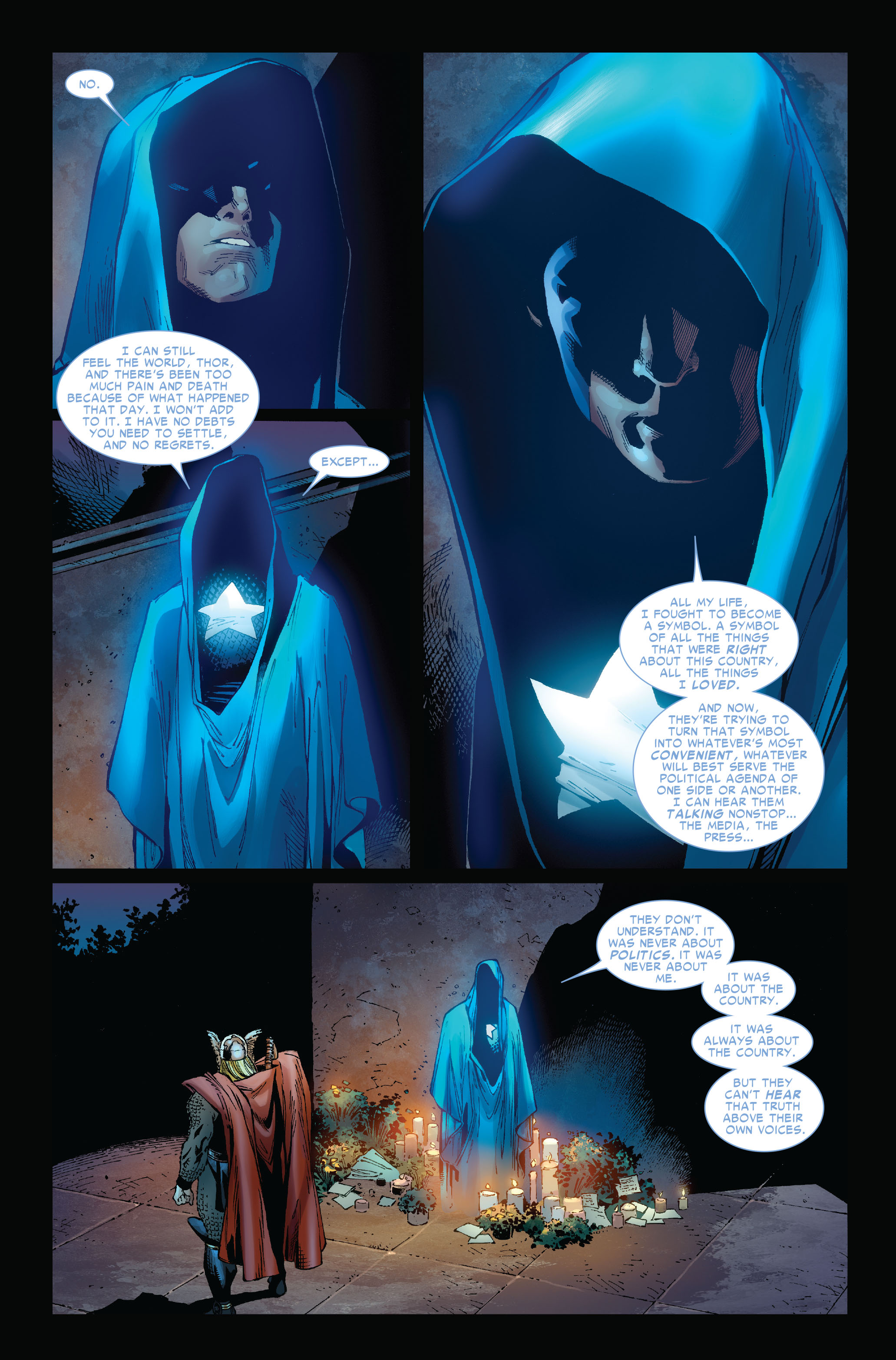 Thor có lẽ là người đầu tiên nhận ra Steve Rogers chưa thật sự “chết” trong các siêu anh hùng. Một năm lễ kỷ niệm ngày ra đi của Steve Rogers, Thor đã tới viếng thăm nơi anh an nghỉ rồi giơ Mjolnir lên trời, hét vang “Avengers Assemble!” như để tưởng nhớ người bạn thủ lĩnh quá cố của mình và muốn ngỏ vài lời tới anh. Bất ngờ, linh hồn của Cap xuất hiện trước mặt thần sấm của chúng ta với hình dạng một hồn ma mặc áo choàng xanh che kín người chỉ để lộ ra chữ A trên mũ của Cap và ngôi sao trước ngực anh.