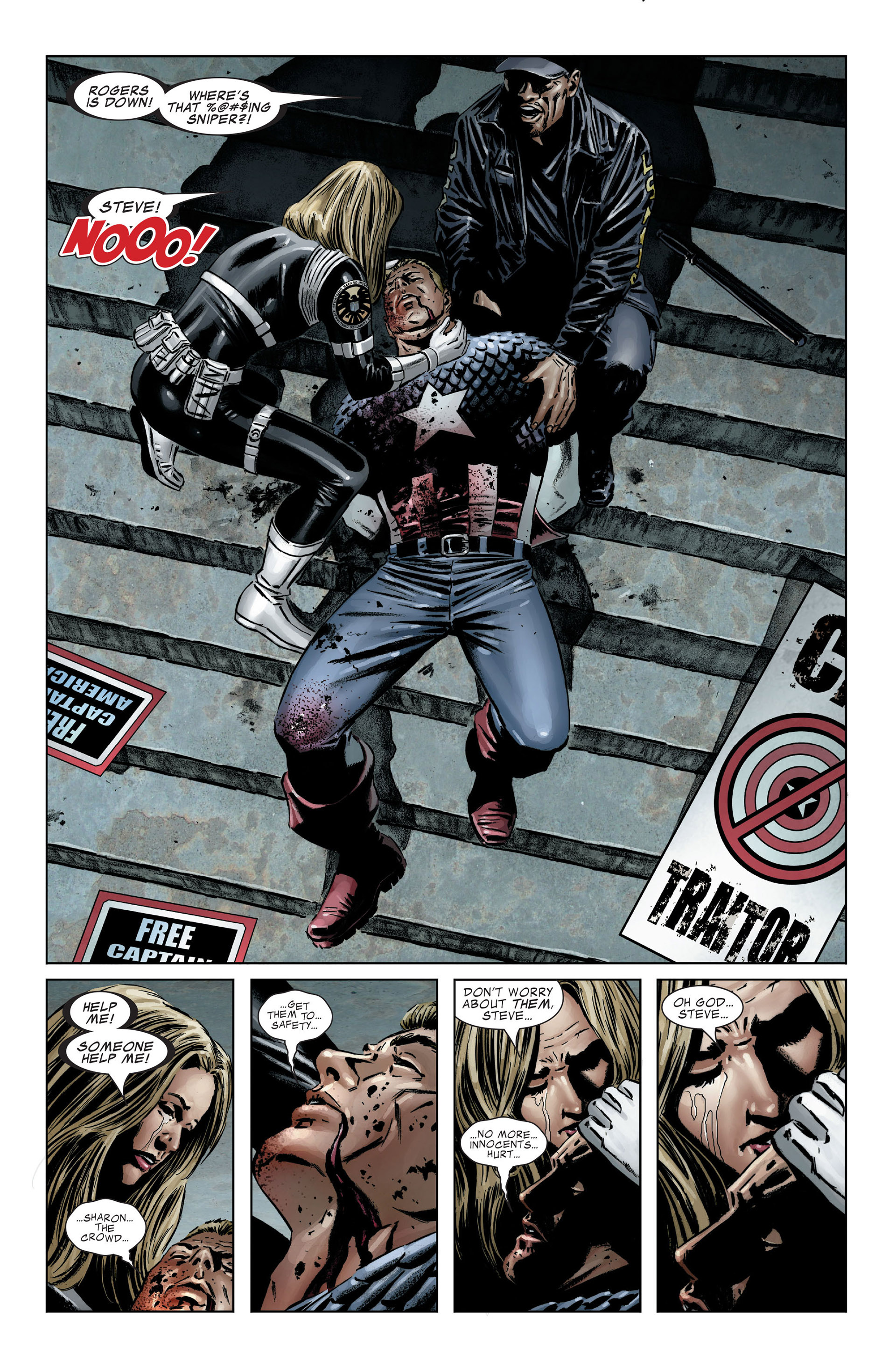 Khi Cap từ từ tiến vào tòa án, anh đã thấy rõ hồng tâm của xạ thủ ghim thẳng vào cảnh vệ ngay trước mình và phát hiện ra vị trí của hắn. Cap đã ngờ tưởng tên xạ thủ nhắm vào mọi người xung quanh anh và trong khi cố giúp anh cảnh vệ, Cap đã đứng đúng vào đường bay của viên đạn. Đám đông trở nên hỗn loạn và bất ngờ, Steve ăn thêm ba phát đạn bí ẩn nữa vào bụng và Sharon cùng anh cảnh vệ đã đỡ anh và gọi cấp cứu. Tuy nhiên mọi thứ đã không còn kịp nữa rồi, Cap trút hơi thở cuối cùng của mình và kể cả trong những lời cuối cùng,anh vẫn thể hiện lên mình là một người hùng vĩ đại như nào.