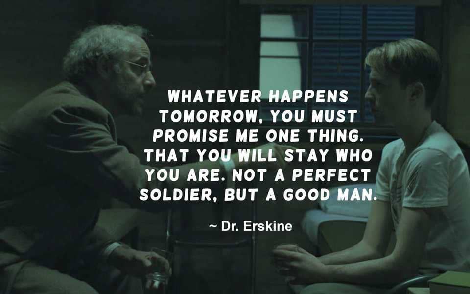 Dẫu câu thoại này không hề dài, nhưng nó lại ẩn chứa ý nghĩa rất lớn, đồng thời chứng minh sự liên kết đáng sợ giữa những sự kiện xảy ra trong toàn bộ vũ trụ điện ảnh Marvel. Chính xác là trong bộ phim Captain America: The First Avengers, trước khi Steve Rogers bước vào thí nghiệm sinh học kia, tiến sĩ Abraham Erskine đã dặn dò anh rằng: “Dù có chuyện gì xảy ra đi nữa, anh phải hứa với tôi một chuyện, rằng anh sẽ luôn là chính bản thân mình: không phải một người lính hoàn hảo, mà là một người đàn ông tốt.”
