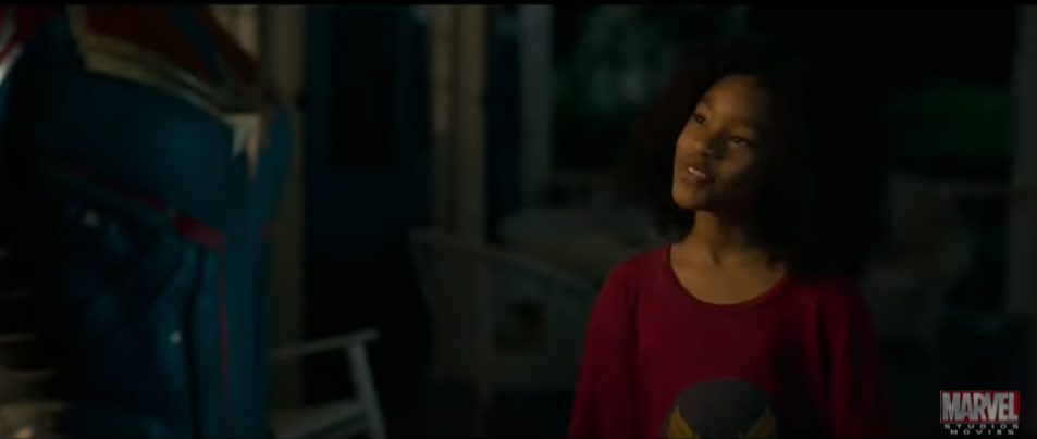 Từ khoảng tháng 9 năm ngoái, người hâm mộ đã biết Lashana Lynch vào vai một phi công không quân - một người bạn cũ thân thiết của Carol, cũng là mẹ của Monica. Điều này cho thấy đứa trẻ xuất hiện trong TV Spot chính là Monica Rambeau - nhân vật sẽ dẫn dắt team Avenger một thời gian trong truyện tranh của Marvel.