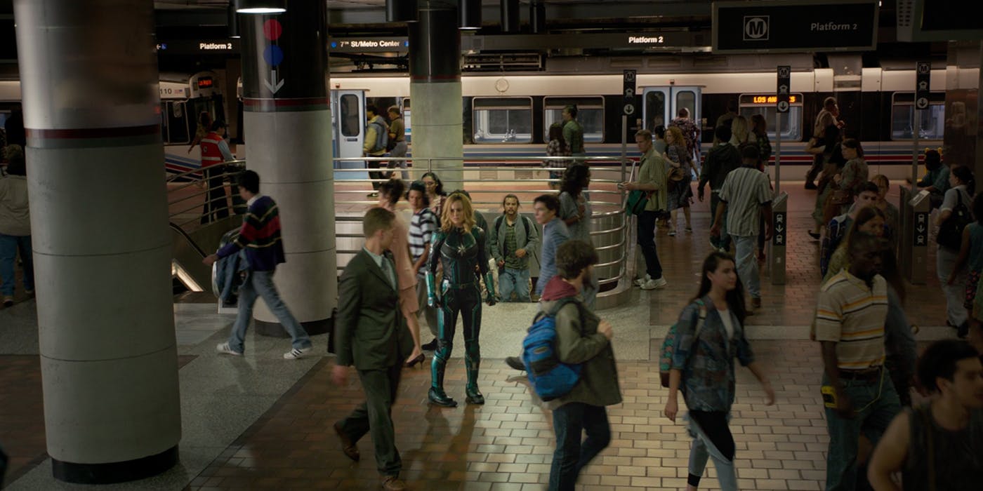 Đoạn trailer đầu tiên của Captain Marvel mở ra với cảnh Carol rơi từ trên trời xuống một cửa hàng Blockbuster Video. Trong khi điều này có vẻ khá cổ điển, nó thực sự thực sự giúp tìm ra bối cảnh của phim: Cửa hàng Blockbuster Video được đổi tên thành Blockbuster vào năm 1996, có nghĩa là Captain Marvel phải xảy ra trước đó. Ngay sau đó, chúng ta thấy Carol ở trạm tàu điện ngầm đường số 7 / Metro Center LA (được chứng minh bằng các biển báo hướng về phía Đường Màu Xanh và Đỏ, chỉ giao nhau ở đó). Red Line đã được khai trương tại nhà ga này vào năm 1993. Sau đó (khi cô ta tát bà già), cô ấy đang trên một chuyến tàu với bản đồ Green Line, được khai trương vào năm 1995. Tất cả điều trên có nghĩa là Captain Marvel được diễn ra từ cuối năm 1995 hoặc đầu năm 1996.