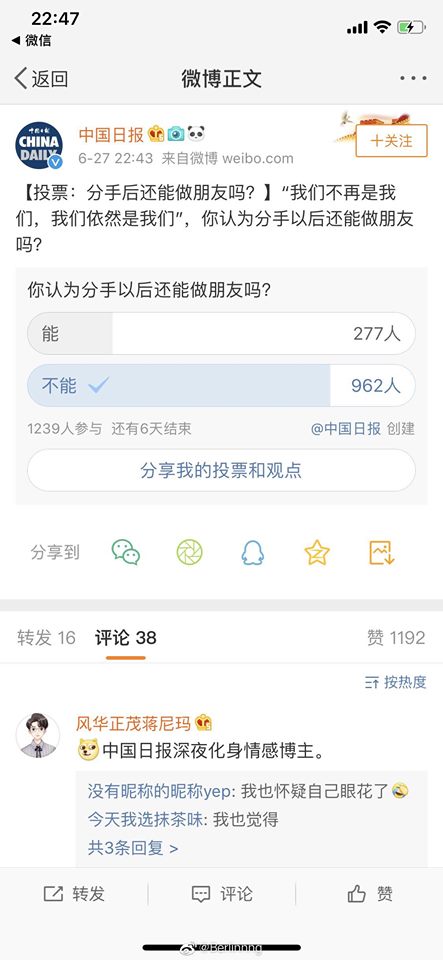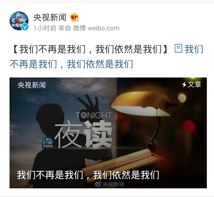 Và có lẽ câu nói “Chúng ta không còn là chúng ta nữa, chúng ta vẫn là chúng ta như xưa” cũng đã chính thức trở thành hot trend mới trên mạng xã hội weibo khi người người, nhà nhà sử dụng câu nói này, đến cả weibo chính thức của CCTV cũng theo trend trong bài viết của mình.