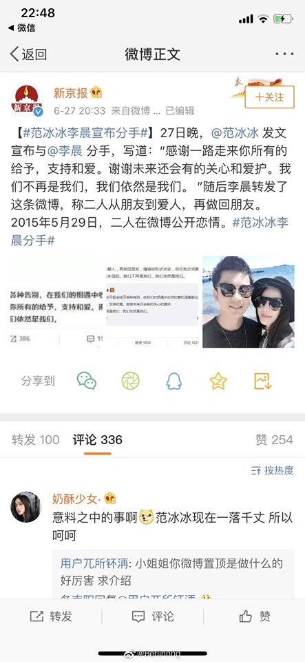 Cách đây không lâu Phạm Băng Băng đăng bài viết trên Weibo: “Con người khi còn sống có thể sẽ trải qua những lần tạm biệt. Tình yêu và sự ấm áp mà chúng ta có được trong những lần gặp gỡ đã biến thành sức mạnh vĩnh cửu. Cảm ơn tất cả những gì mà anh cho em đến bây giờ, sự kiên trì cùng với tình yêu. Cám ơn tương lai còn có thể quan tâm cùng bảo vệ. Chúng ta không còn là chúng ta nữa, chúng ta vẫn là chúng ta như xưa“.