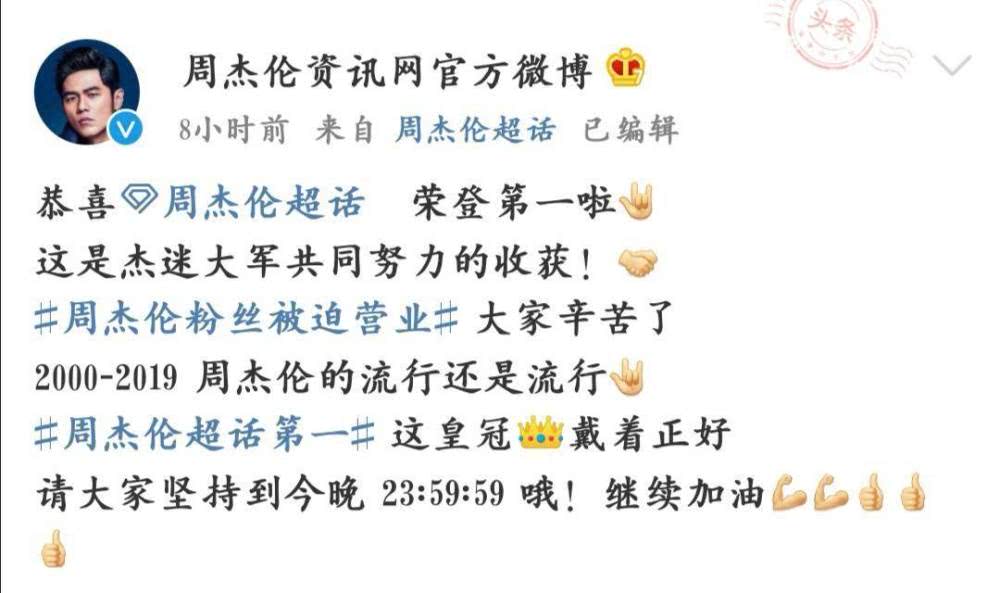 Về việc fan hai nhà vẫn đang cạnh tranh nhau về vị trí thứ nhất của nhóm siêu chủ đề thì weibo chính thức fandom nhà Châu Kiệt Luân lên tiếng, bày tỏ hy vọng fan hâm mộ có thể tiếp tục duy trì vị trí số 1 trong tuần này. Bất luận fan hâm mộ Châu Kiệt Luân đơn thuần chỉ muốn “chơi đùa” hay thật sự muốn chứng minh nhân khí của thần tượng thì sự nỗ lực của fan Châu Kiệt Luân trong việc cày số liệu là thật. Trong khi đó, phía Thái Từ Khôn không biết vì muốn giành lại vị trí thứ nhất trong hơn 50 tuần trước đó hay muốn chứng minh idol nhà mình không phải là lưu lượng giả cũng ra sức cạnh tranh, không muốn từ bỏ kỷ lục này.