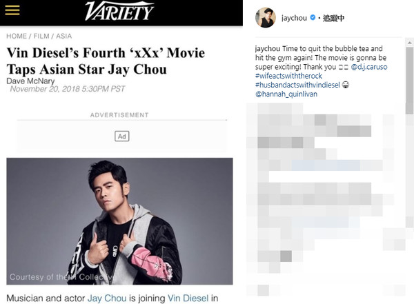 Sina đưa tin, theo báo cáo của truyền thông Đài Loan, ngày 21 tháng 11 bộ phim bom tấn Hollywood Cực hạn đặc công 4 (极限特工4) đã đưa công bố chính thức “Thiên vương” Châu Kiệt Luân (周杰伦) sẽ tham gia bộ phim hợp tác cùng ngôi sao Hollywood Vin Diesel. Châu Kiệt Luân rất vui vẻ chia sẻ thông báo này trên mạng xã hội, với dòng trạng thái có nội dung muốn từ bỏ trà sữa để tích cực tập thể hình. Dòng chia sẻ này đã mang lại tiếng cười lớn cho fan hâm mộ.