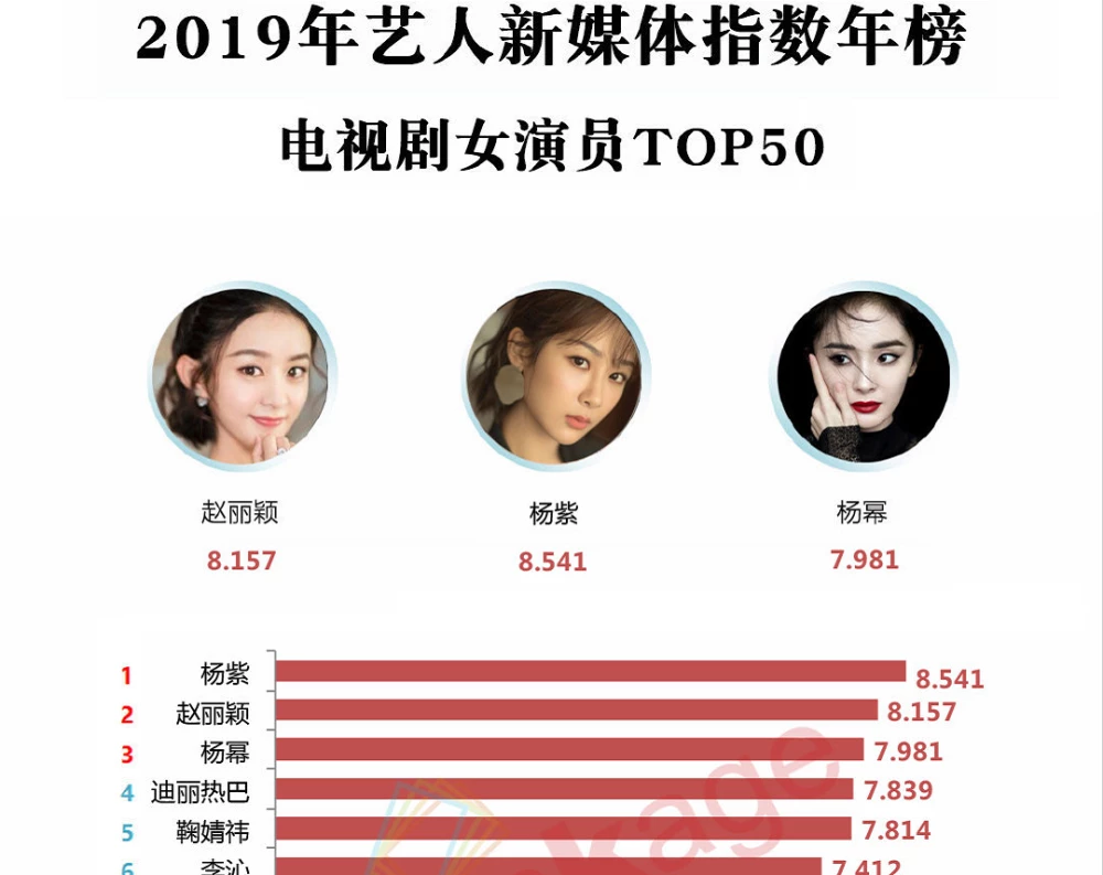 Dẫn đầu với chỉ số bứt phá, bỏ xa hai đối thủ còn lại chính là nàng tiểu hoa Dương Tử. Năm 2019, thành tích lẫn độ ảnh hưởng của Dương Tử đạt được là điều hết sức rõ rệt. Hai năm liên tiếp có những tác phẩm đạt được thành tích rating cao trên những đài truyền hình, bộ phim điện ảnh mà Dương Tử tham gia cũng tạo được tiếng vang tốt. Danh tiếng, khả năng ủng hộ của fan lẫn độ chủ đề đều dẫn đầu trong năm nay, Dương Tử vượt qua Triệu Lệ Dĩnh lẫn Dương Mịch là một điều vô cùng xứng đáng.