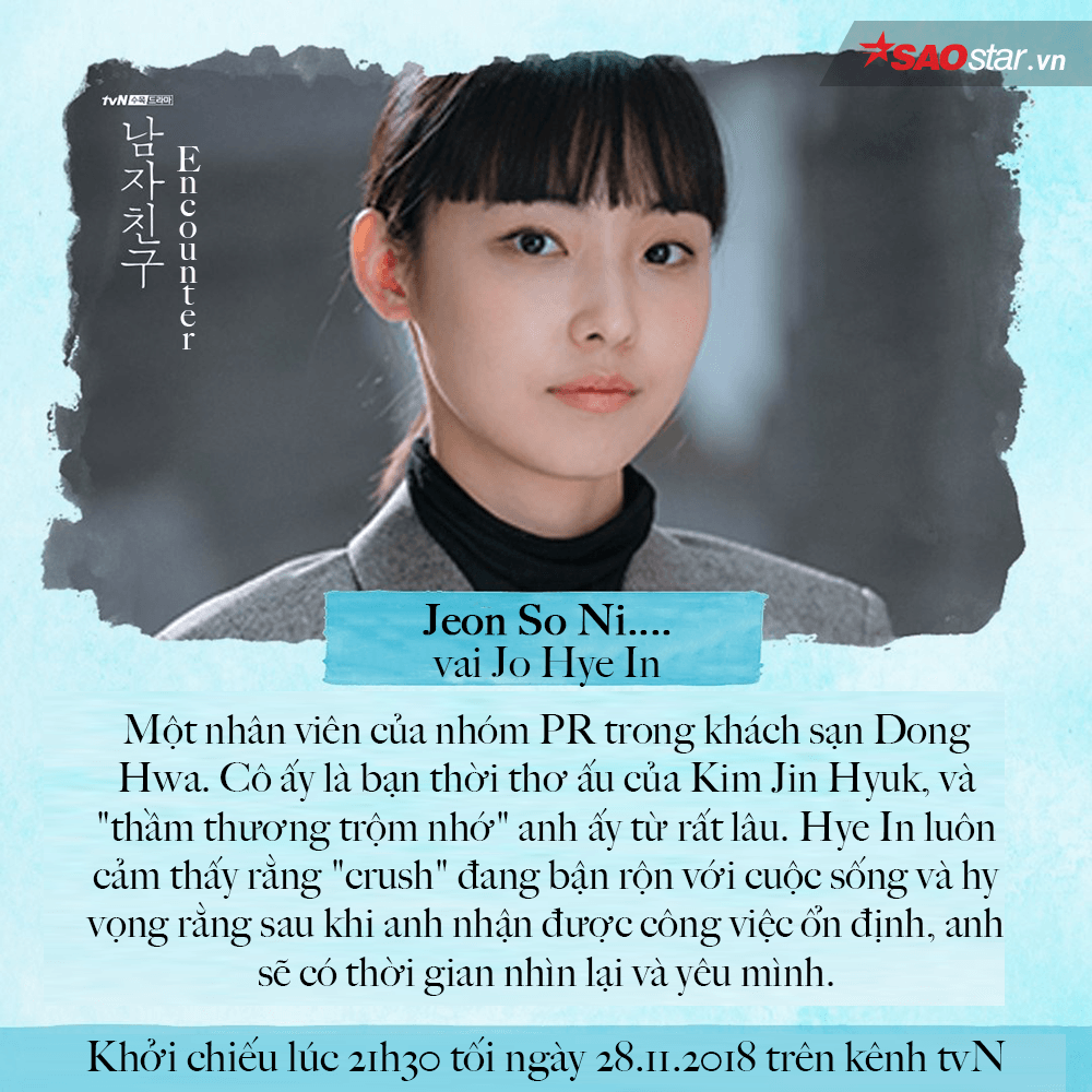 Jeon So Ni: Jo Hye In, một nhân viên của nhóm PR trong khách sạn Dong Hwa. Cô ấy là bạn thời thơ ấu của Kim Jin Hyuk, và “thầm thương trộm nhớ” anh ấy từ rất lâu. Hye In luôn cảm thấy rằng “crush” đang bận rộn với cuộc sống và hy vọng rằng sau khi anh nhận được công việc ổn định, anh sẽ có thời gian nhìn lại và yêu mình.