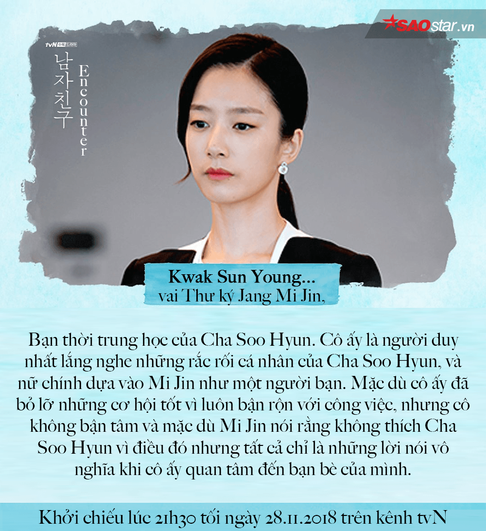 Kwak Sun Young: Thư ký Jang Mi Jin, bạn thời trung học của Cha Soo Hyun. Cô ấy là người duy nhất lắng nghe những rắc rối cá nhân của Cha Soo Hyun, và nữ chính dựa vào Mi Jin như một người bạn. Mặc dù cô ấy đã bỏ lỡ những cơ hội tốt vì luôn bận rộn với công việc, nhưng cô không bận tâm và mặc dù Mi Jin nói rằng không thích Cha Soo Hyun vì điều đó nhưng tất cả chỉ là những lời nói vô nghĩa khi cô ấy quan tâm đến bạn bè của mình.