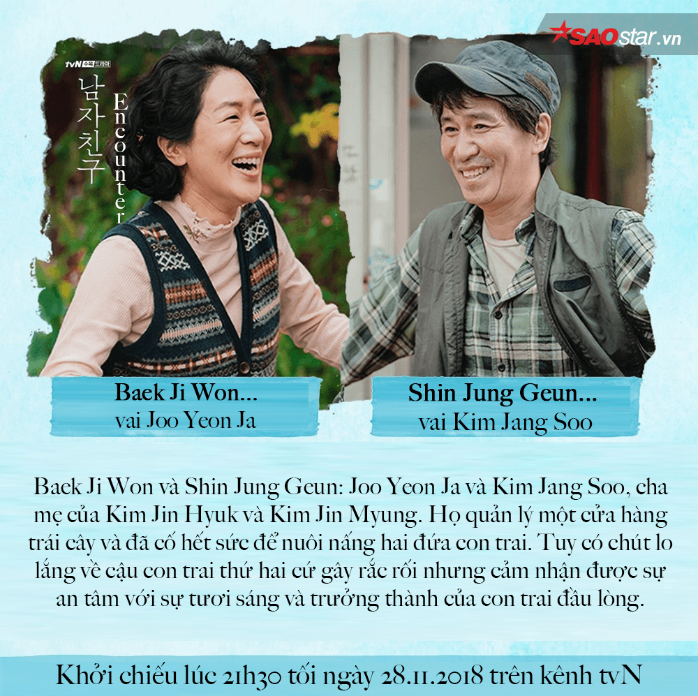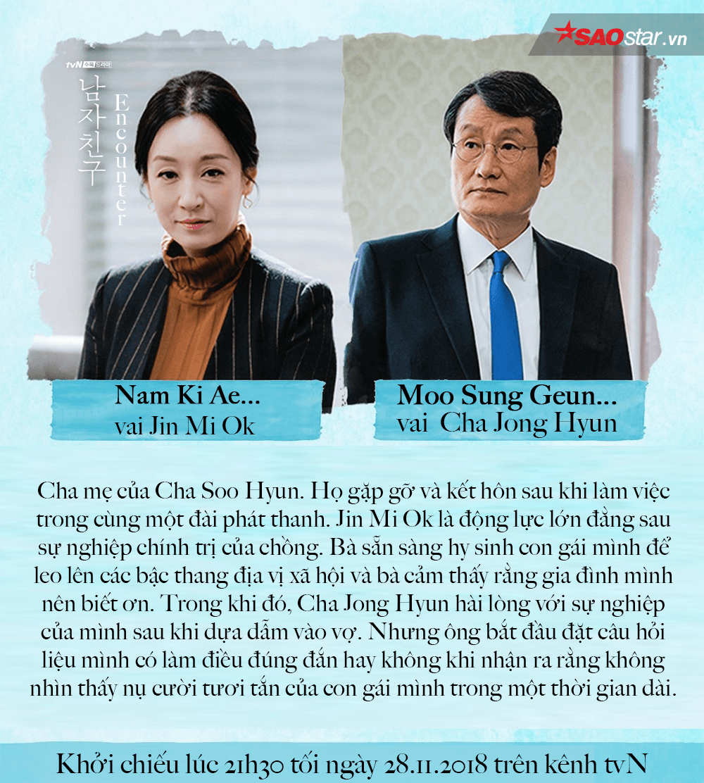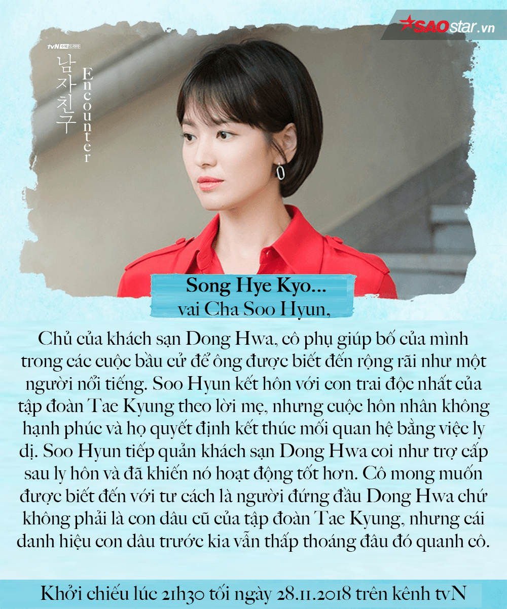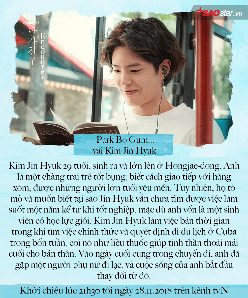 Ngày 24/11, tvn Drama đã chia sẻ các chi tiết cụ thể mô tả về từng nhân vật trong bộ phim mới Encounter/Boyfriend (남자친구: Bạn trai) do Park Bo Gum và Song Hye Kyo dẫn đầu.