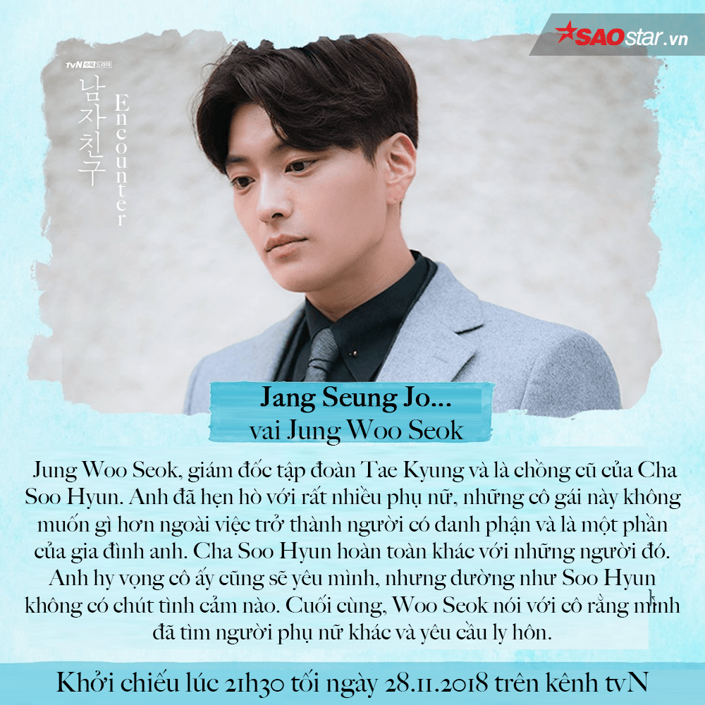 Jang Seung Jo sẽ đóng vai Jung Woo Seok, giám đốc tập đoàn Tae Kyung và là chồng cũ của Cha Soo Hyun. Anh đã hẹn hò với rất nhiều phụ nữ, những cô gái này không muốn gì hơn ngoài việc trở thành người có danh phận và là một phần của gia đình anh. Cha Soo Hyun hoàn toàn khác với những người đó. Anh hy vọng cô ấy cũng sẽ yêu mình, nhưng dường như Soo Hyun không có chút tình cảm nào. Cuối cùng, Woo Seok nói với cô rằng mình đã tìm người phụ nữ khác và yêu cầu ly hôn.