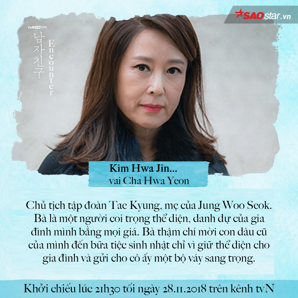 Kim Hwa Jin: Cha Hwa Yeon, chủ tịch tập đoàn Tae Kyung, mẹ của Jung Woo Seok. Bà là một người coi trọng thể diện, danh dự của gia đình mình bằng mọi giá. Bà thậm chí mời con dâu cũ của mình đến bữa tiệc sinh nhật chỉ vì giữ thể diện cho gia đình và gửi cho cô ấy một bộ váy sang trọng.