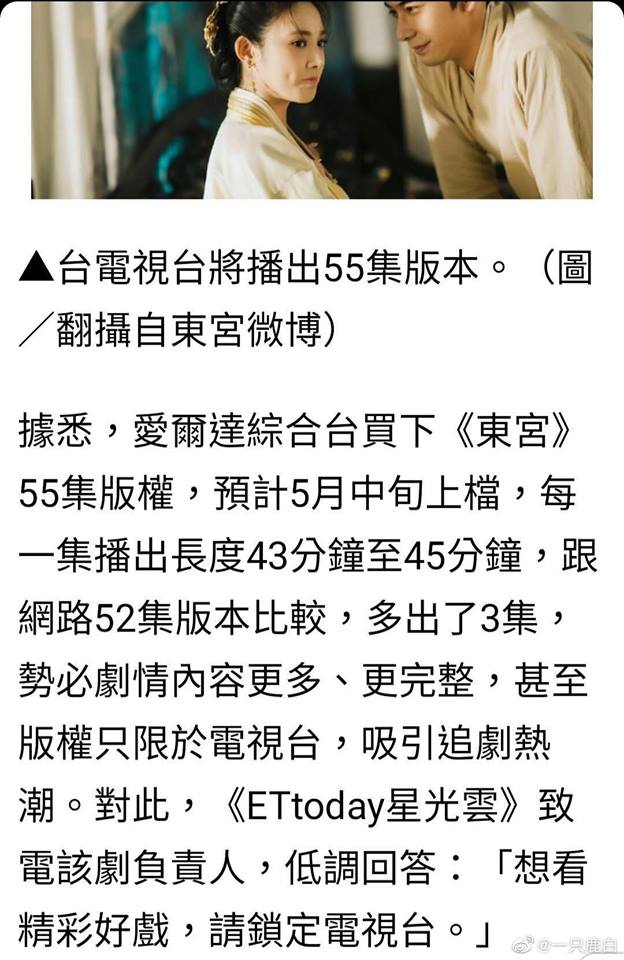Nhưng có lẽ khán giả sẽ không cần phải lo lắng nữa khi mới đây đài truyền hình Đài Loan đã mua lại bản quyền Đông cung, dự tính sẽ công chiếu vào giữa tháng 5 này với thời lượng là 55 tập - nhiều hơn 3 tập so với bản công chiếu trước đây trên Youku.