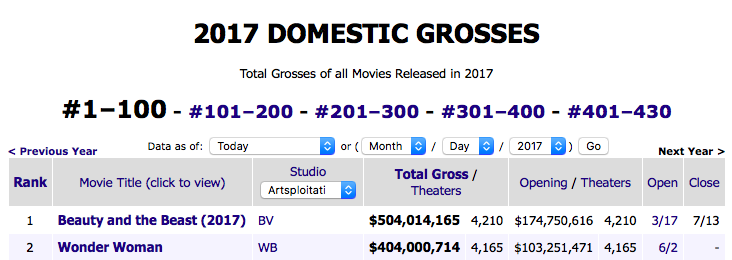 Con số mà Wonder Woman mang lại ở thị trường trong nước hiện đang đứng vị trí thứ hai và mặc dù chắc chắn bộ phim không có cơ hội đuổi kịp bộ phim đứng hạng nhất - Beauty and the Beast của Disney với doanh thu 504 triệu USD.