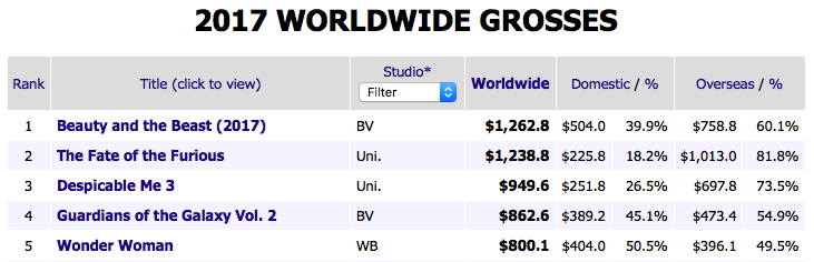 Doanh thu đứng đầu trong năm 2017 chỉ thua mỗi Beauty and the Beast.