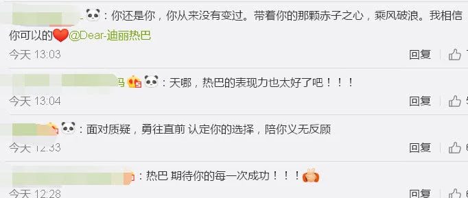 Dưới bài đăng, nhiều bình luận cổ vũ của fan hâm mộ Địch Lệ Nhiệt Ba giành tặng cho thần tượng: “Bạn vẫn là bạn, chưa bao giờ thay đổi”, “Mang theo tấm lòng, quyết tâm của bạn, vượt qua sóng gió”, “Tôi tin tưởng bạn có thể”, “Đối mặt với những nghi ngờ, dũng cảm tiến bước trên con đường mình đã chọn, cùng bạn quyết không lùi bước“.