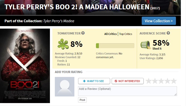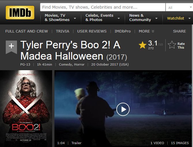 Hẳn nhiều người sẽ trợn tròn mắt và tự nhủ “Cái quái gì đang xảy ra thế kia?” khi biết thông tin này? Đây không là giấc mơ khi Boo 2! A Madea Halloween đạt điểm A- của CinemaScore sau ngày đầu tiên nhưng chỉ 17 điểm từ Metacritic.