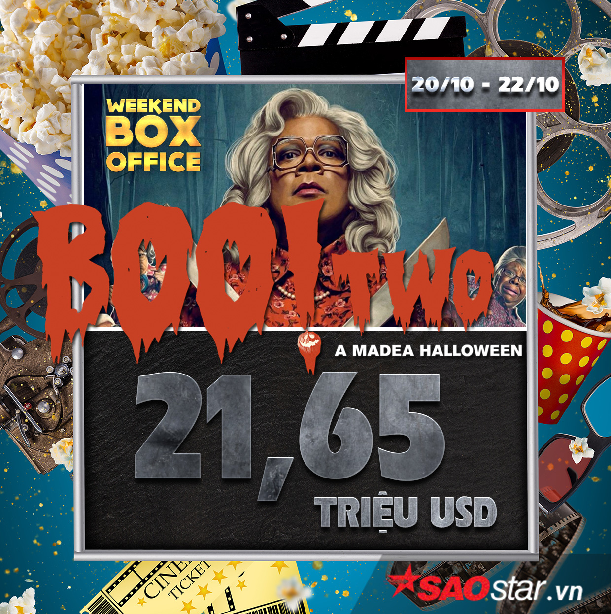 “Ông hoàng” của doanh thu phòng vé 3 ngày cuối tuần vừa qua chính là phim kinh dị hài Tyler Perry's Boo 2! A Madea Halloween của đạo diễn Tyler Perry. Tyler Perry không chỉ đặt tên mình cho bộ phim này mà còn đảm nhận… biên kịch và diễn viên chính. Ngay từ phần 1 ra mắt vào năm 2016, Boo! A Madea Halloween chỉ đạt 21% trên Rotten Tomatoes và 4,7 điểm IMDb, cùng với doanh thu tại Mỹ là 73,2 triệu USD, trong khi tại các thị trường khác chỉ vỏn vẹn… 1 triệu USD. Tuy vậy, với kinh phí 20 triệu USD thì có thể đánh giá bộ phim của Tyler Perry ở mức khá, không đến nỗi lỗ, thậm chí là có thể lời một chút đỉnh.