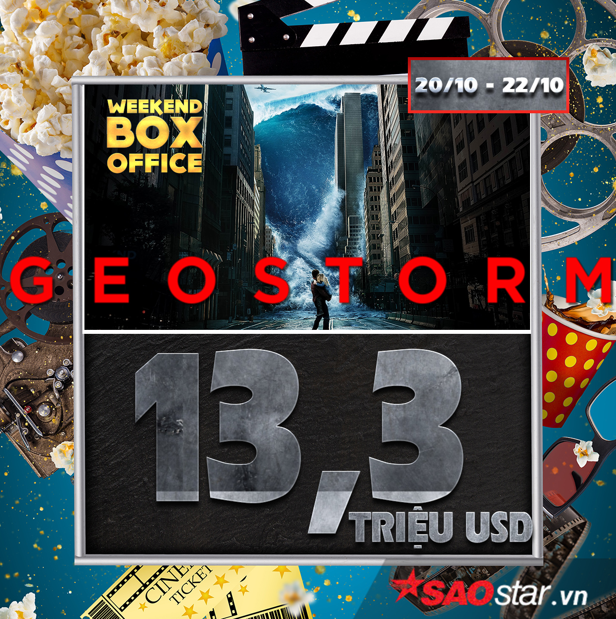 Vị trí thứ 2 thuộc về Geostorm của hãng Warner Bros. Bộ phim khoa học viễn tưởng về siêu bão địa cầu và những thay đổi khí hậu đáng quan tâm trong những năm gần đây đã thu hút khán giả Bắc Mỹ. Với 13,3 triệu USD trong 3 ngày đầu tiên công chiếu, phim Geostorm nhận điểm B- từ CinemaScore, nhưng tệ hại hơn là bộ phim chỉ đạt 21 điểm của Metacritic. Đây là điểm số vô cùng ngán ngẩm của bất kỳ bộ phim nào như minh chứng chất lượng của nó. Điều khá thú vị từ Geostorm chính là, 75% khán giả xem phim trên 25 tuổi, ngoài ra nam giới có vẻ hứng thú với bộ phim này hơn - với 66%.