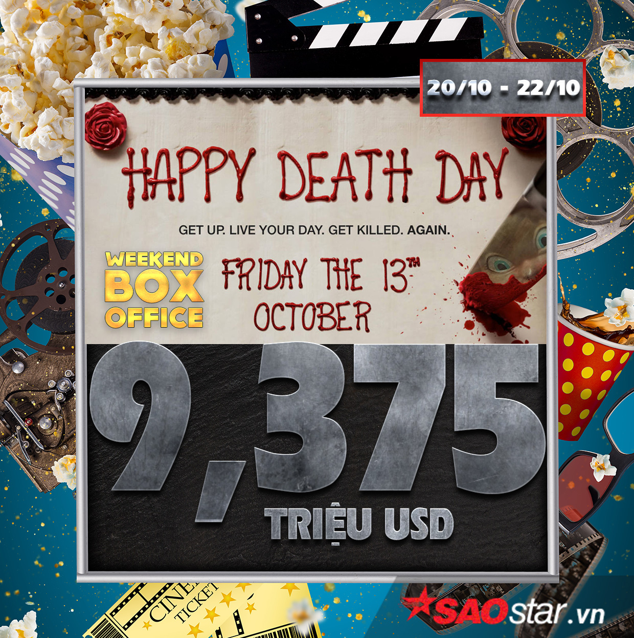 Happy Death Day của hãng Universal và Blumhouse đang hạ nhiệt dần khi về vị trí thứ 3, giảm 64% so với tuần trước với doanh thu ước tính chỉ 9,37 triệu USD. Bộ phim này cũng sẽ ra mắt tại Việt Nam từ 27/10.
