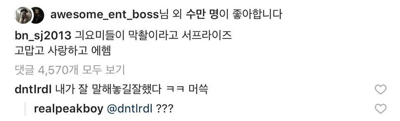 Ngay sau khi bức ảnh được tải lên, Choi Woo Shik đã giả vờ ngạc nhiên và để lại một bình luận, “Tôi đã bảo họ làm như vậy ㅋㅋ Lúng túng”. Park Seo Joon đùa giỡn cùng với người bạn thân nhất của mình và trả lời: “Wow, thích cái này ư?”. Peakboy cũng trả lời anh ấy, “???”.
