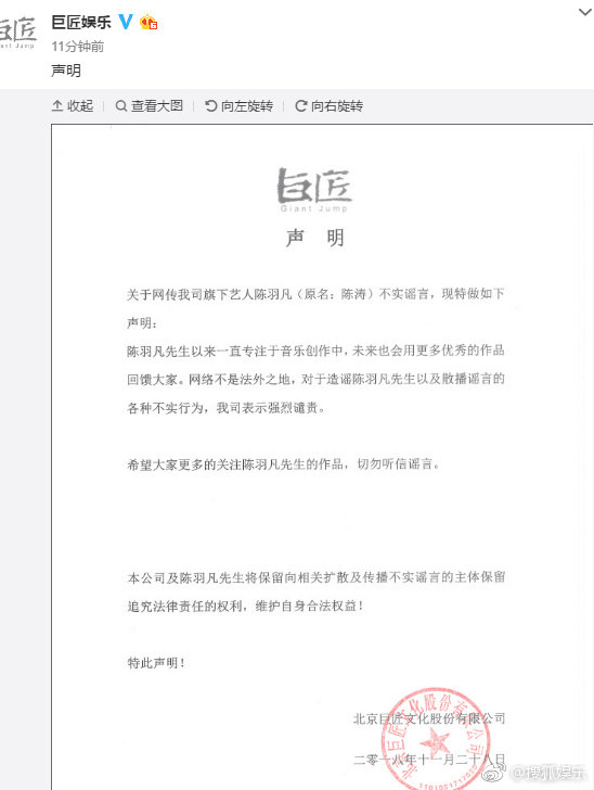 Mới đây, Trần Vũ Phàm đã chính thức đăng văn bản thanh minh trên Weibo, phủ nhận hoàn toàn những tin đồn thất thiệt ảnh hưởng đến danh dự của anh, mong mọi người không nên tin vào những lời vô căn cứ.