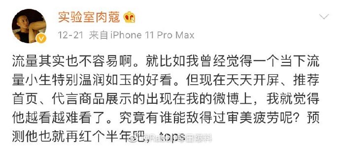Gần đây, chủ biên phòng thực nghiệm của GQ - Rocco Liu đã đăng tải hai bài viết khá nhiều chữ với nội dung gây tranh cải và làm dân mạng tranh luận không ngừng. Bài đầu tiên như sau: Lưu lượng thực sự cũng không phải dễ dàng. Ví dụ như tôi từng cảm thấy có một tiểu sinh lưu lượng đặc biệt xinh xắn, ôn hòa như ngọc. Nhưng hiện giờ ngày ngày mở điện thoại lên đều thấy mấy hạng mục quảng cáo, đại diện sản phẩm,… xuất hiện trên Weibo của tôi. Tôi cảm thấy người này ngày càng khó coi. Tôi dụ đoán người này chỉ nổi thêm được nửa năm.
