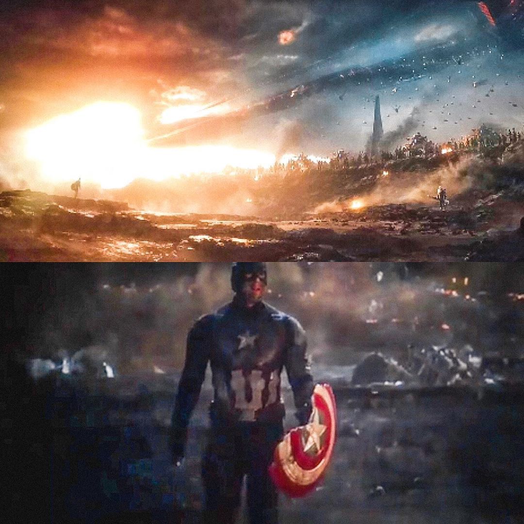 Liên kết với những sự kiện trong Endgame, người xem có thể dễ dàng nhận thấy khoảnh khắc khi tất cả các siêu anh hùng khác đều chịu nhiều chấn thương sau khi Thanos rải mưa đạn lên trụ sở của nhóm Avengers. Thậm chí Iron Man và thần sấm Thor (phiên bản bụng bự 2 búa) cũng đã bị hạ nốc ao. Chính lúc đó, binh đoàn của Thanos xuất hiện, và Cap sẵn sàng 1 mình chiến đấu với tất cả bọn chúng chỉ với một nửa chiếc khiên.