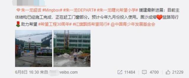 Tuy bận rộn việc quay hình nhưng Chu Nhất Long vẫn chăm làm việc thiện nguyện. Gần đây, có cư dân mạng tiết lộ trường tiểu học dưới sự hỗ trợ của Chu Nhất Long đang trong quá trình hoàn thành thi công, và dự kiến sẽ đưa vào sử dụng vào tháng 9.
