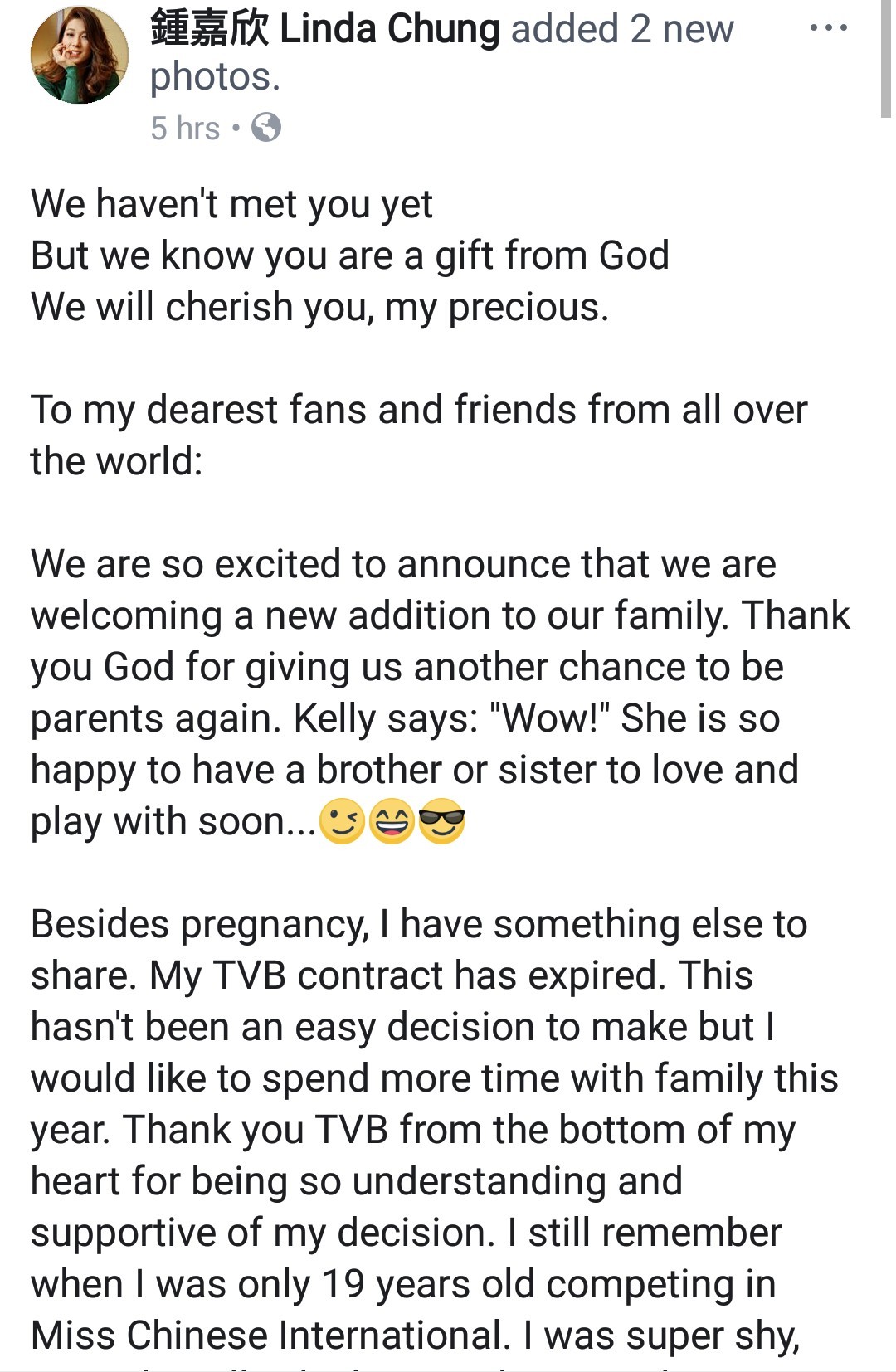 Vài tiếng đồng hồ trước, Chung Gia Hân đã chia sẻ dòng trạng thái khá dài trên trang Facebook cá nhân của mình. Linda thông báo cô đã mang thai đứa con thứ hai và xem đó như một món quà Chúa ban tặng cho gia đình. Kelly cũng hết sức hào hứng trước tin vui này, vì sắp tới cô nàng sẽ có người vui chơi cùng.