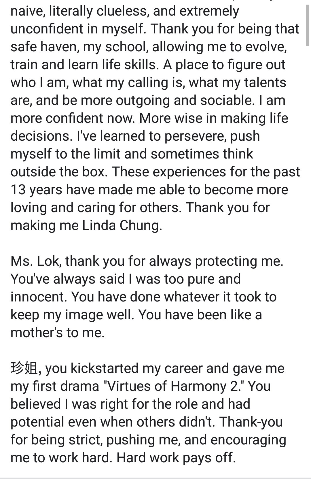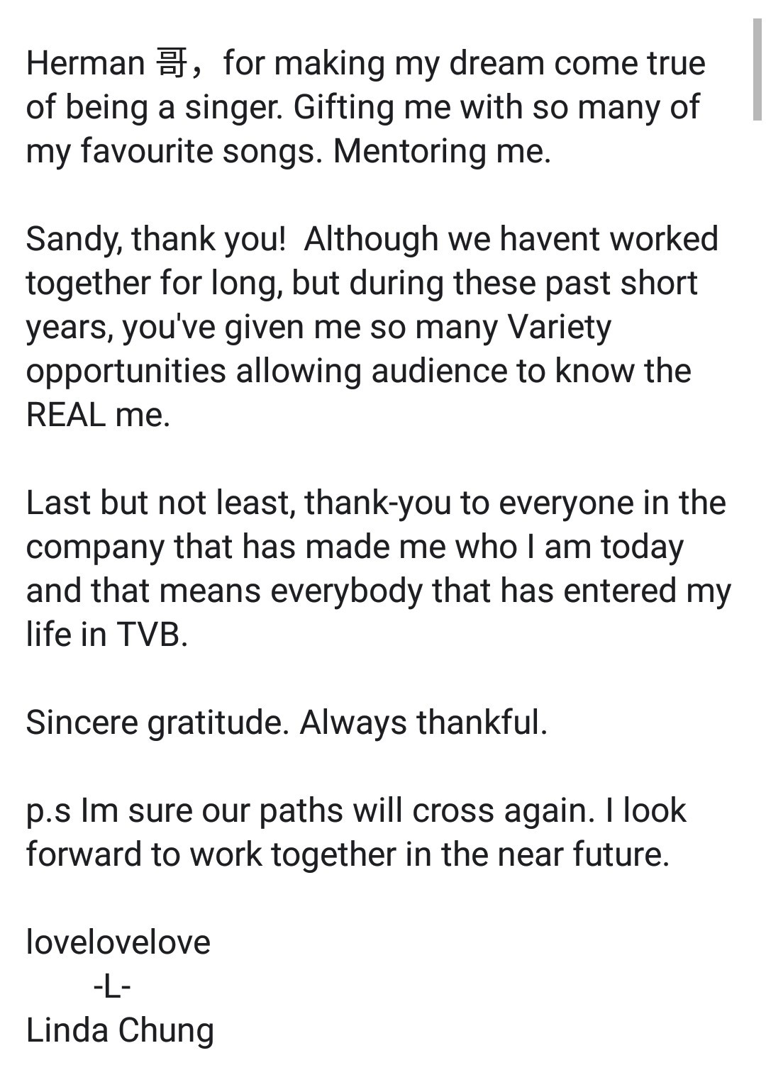 Cô viết: “Đây không phải là một quyết định dễ dàng để thực hiện nhưng tôi muốn dành nhiều thời gian hơn cho gia đình vào năm nay. Từ đáy lòng, cảm ơn TVB đã hiểu và ủng hộ quyết định này của tôi. Tôi vẫn còn nhớ khi dự thi Hoa hậu Quốc tế, tôi chỉ mới 19 tuổi. Tôi rất ngại ngùng, ngây thơ, thật sự thiếu kỹ năng và rất không tự tin vào bản thân. Cảm ơn vì đã trở thành nơi neo đậu an toàn, trường học của tôi, cho phép tôi tiến bộ, đào tạo tôi và giúp tôi học được những kĩ năng trong cuộc sống. Một nơi đã giúp tôi nhận ra mình là ai, mình được gọi là gì, tôi sở hữu tài năng gì, và khiến bản thân tôi cởi mở hơn. Bây giờ, tôi đã tự tin hơn. Khôn khéo hơn khi đưa ra những quyết định trong cuộc sống. Tôi học cách kiên trì, đẩy bản thân mình đến những giới hạn và đôi khi suy nghĩ thoáng hơn. Những trải nghiệm này trong 13 năm qua đã giúp tôi trở nên biết yêu thương và quan tâm đến người khác. Cảm ơn vì đã làm nên tôi - Linda Chung.”