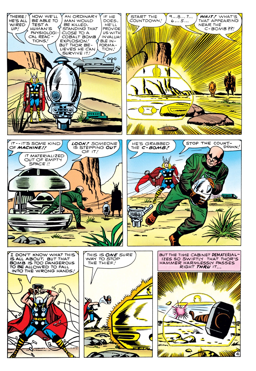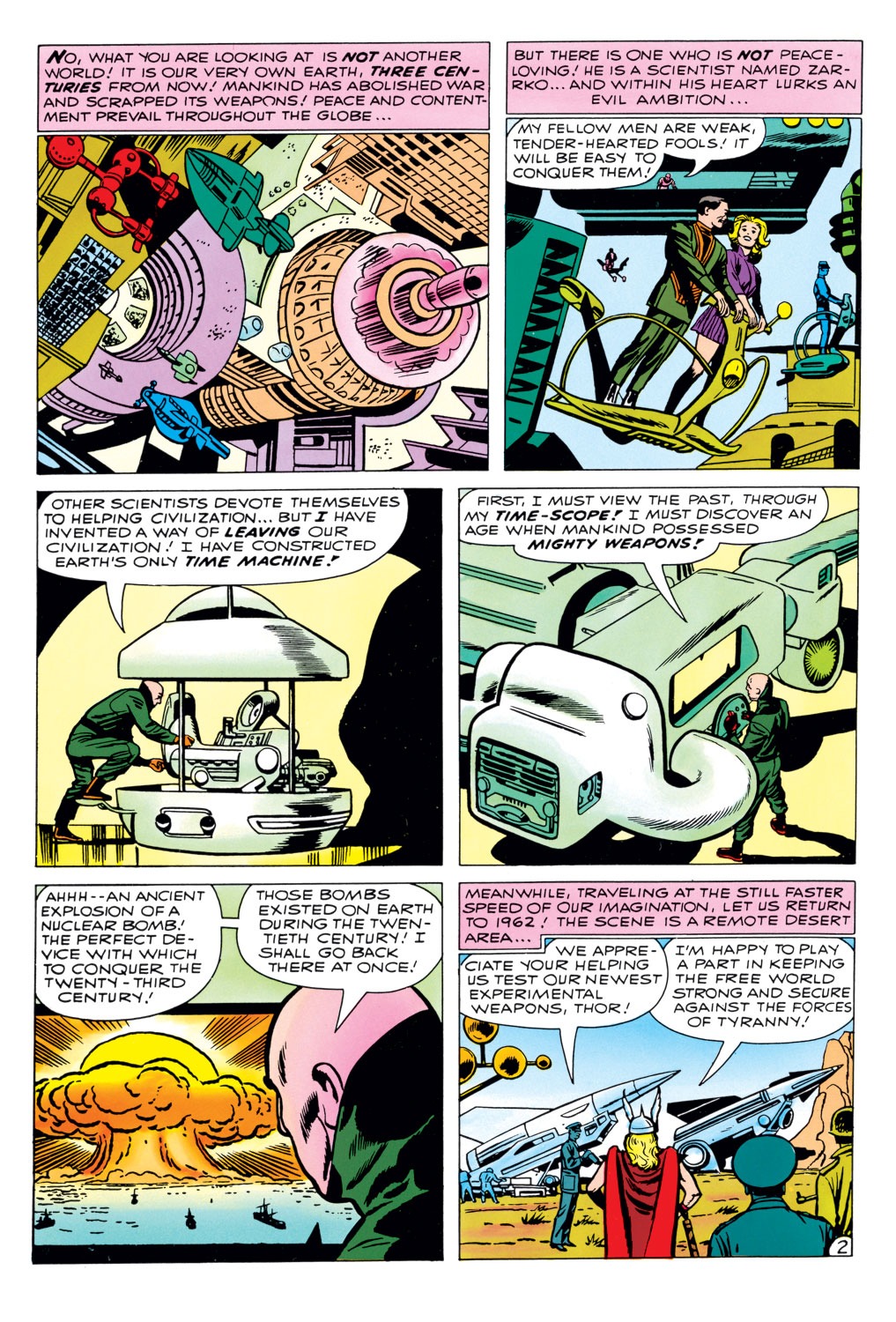 Vào thời điểm đó, Thor đang tham gia cuộc thử nghiệm quân sự của chính phủ. Đầu tiên họ thử nghiệm kiểm tra tốc độ của anh so với tên lửa và đưa ra kết luận rằng anh nhanh hơn so với quả tên lửa nhiều. Tiếp theo họ thử nghiệm bằng cách cho anh đứng cạnh một quả C-Bomb. Dẫu biết nó có khả năng giết luôn 1 người bình thường, Thor vẫn khẳng định nó không hề ảnh hưởng tới anh. Ngay khi cuộc thử nghiêm chuẩn bị được bắt đầu, chiếc máy thời gian của Tomorrow Man xuất hiện. Hắn lén lút cướp lấy quả bom rồi chạy về máy thời gian. Thor đã phát hiện ra và phi Mjnoir về phía hắn nhưng đã quá muộn. Chỉ kịp làm nứt 1 mảnh tàu của Zarko.