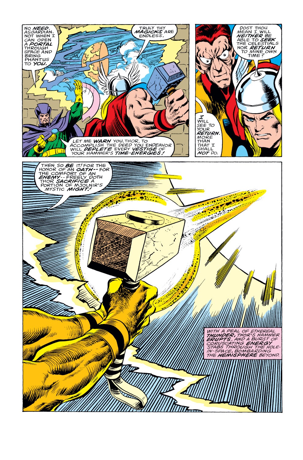 Trước đó, Thor bị Space Phantom dùng như một lon nhiên liệu để đưa hành tinh của hắn trở lại. Tuy nhiên xa cách chiếc búa quá lâu, Thor dần trở lại thành Donald Blake. Quá hoảng hốt, Space Phantom kéo Thor ra và hứa tìm cho anh Mjolnir với giao kèo anh sẽ đem trở về hành tinh của hắn. Thor và Space Phantom kéo tới lâu đài của Immortus để giành lại búa của mình.