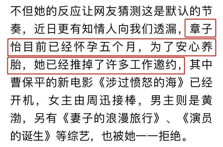 Ngày trước, bởi vì tin đồn này mà Chương Tử Di xuất hiện trên hot search Weibo, thế nhưng cô không hề đáp lại. Dân mạng suy đoán lẽ nào nữ diễn viên đang ngầm thừa nhận chuyện này. Theo như người trong giới giải trí tiết lộ thì hiện tại Chương Tử Di đang mang thai được năm tháng, vì an tâm dưỡng thai đã từ chối không ít công việc.