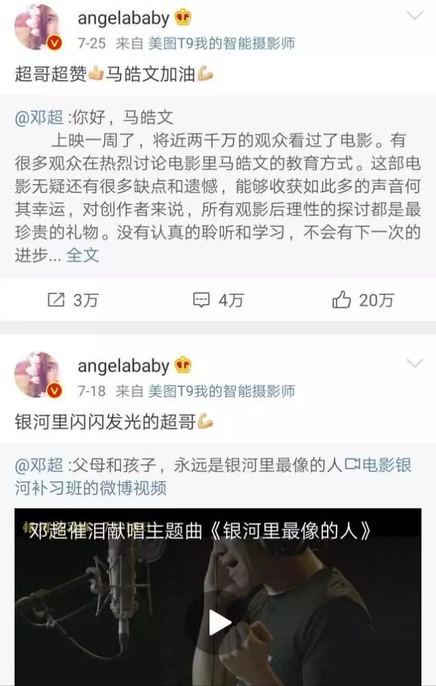 Vì ủng hộ Đặng Siêu đảm nhận vai chính trong bộ phim điện ảnh Trường luyện thi Ngân hà mà Angelababy tích cực liên tục share bài quảng cáo cho đồng nghiệp. Trong khi đó, phim mới của ông xã Huỳnh Hiểu Minh - Liệt hỏa anh hùng do anh đóng vai chính cũng sắp ra mắt trên hệ thống các rạp, thế nhưng Angelababy lại không có bất kỳ hành động hỗ trợ, quảng bá nào.