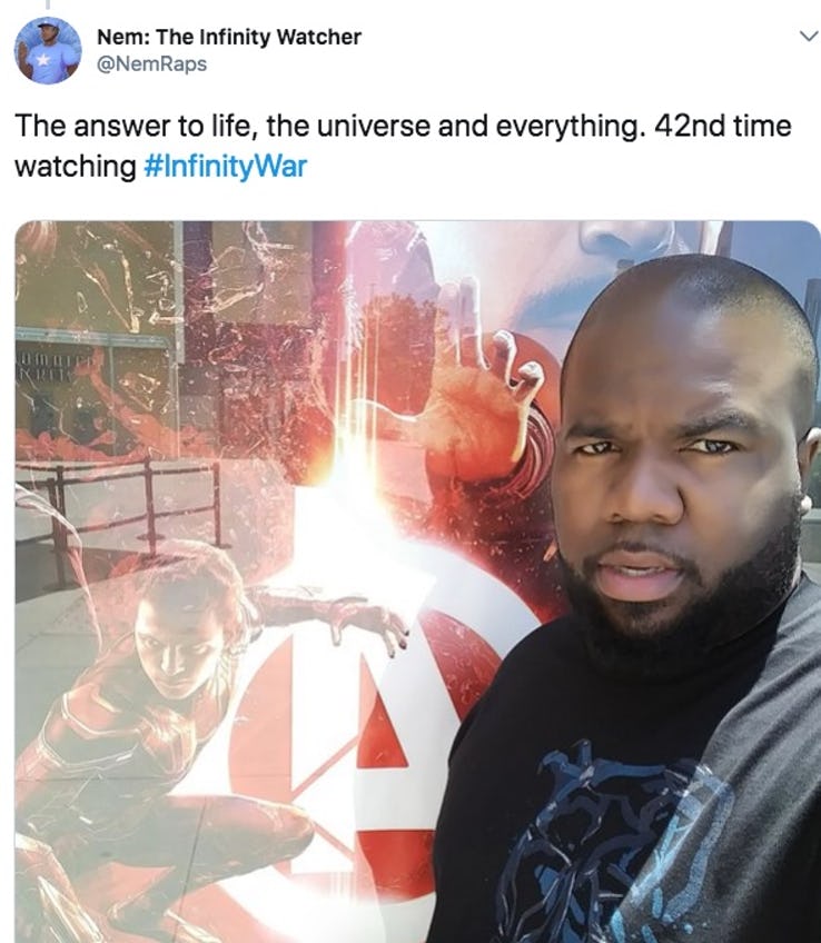 Một tài khoản trên Twitter có tên Nem: The Infinity Watcher đã liên tục post lên mạng xã hội của mình những tấm hình selfie cũng như những tấm vé xem phim, minh chứng cho kỷ lục đi xem 42 lần Infinity War của mình (tính đến hiện tại là 44 lần rồi). Lượt follow tài khoản anh chàng tăng chóng mặt khi hàng loạt các trang báo mạng đăng tin tức này về anh. Tuy nhiên một số thành phần lại nghĩ rằng anh chàng này hình như không được tỉnh táo mới đi xem tận 42 lần như vậy. Những bài post của anh chàng cho thấy, kể từ khi phim công chiếu hồi tháng 4, hầu như ngày nào anh ta cũng đi xem, có ngày xem tận 2 lần.