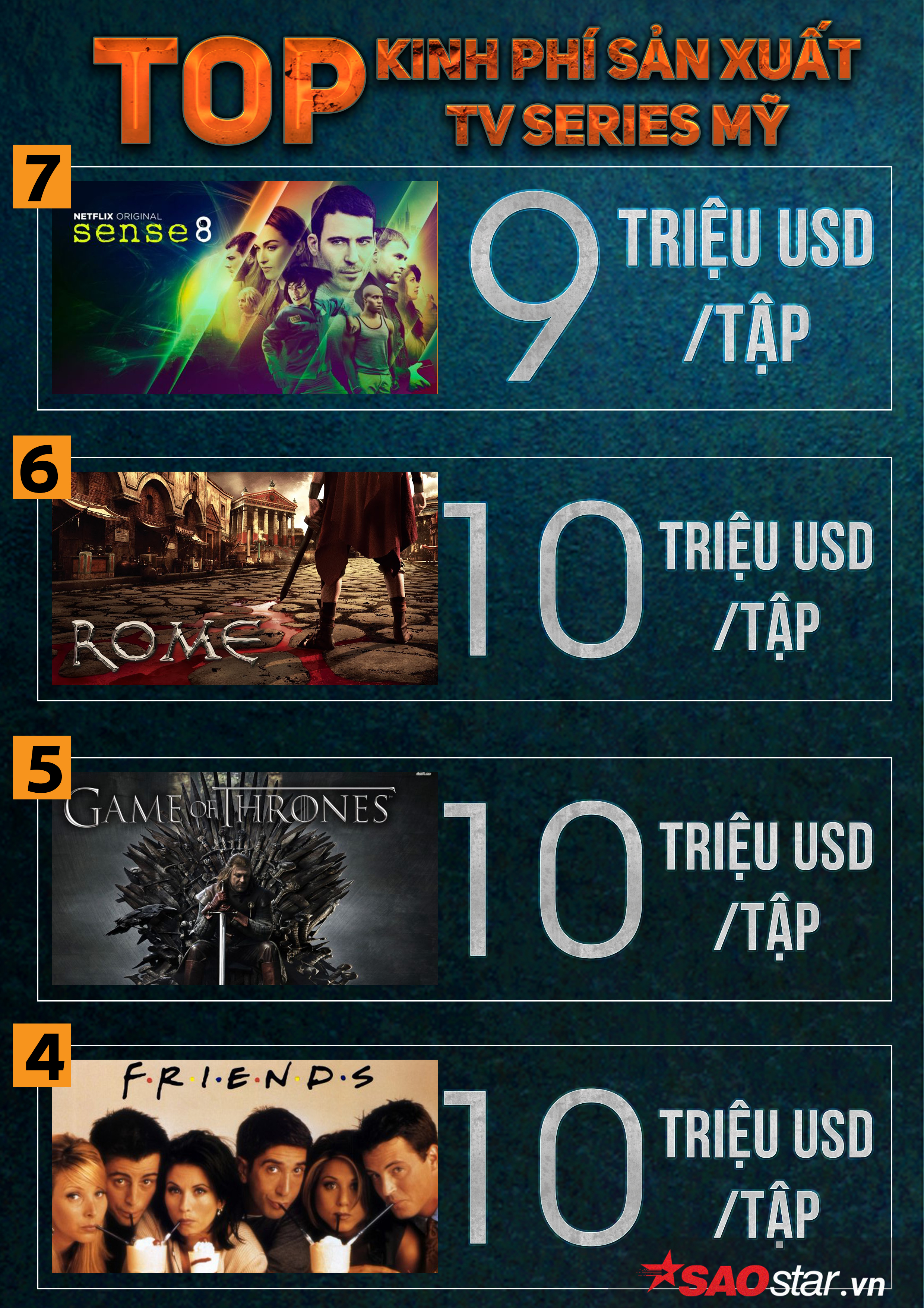 Ít ai ngờ đến phim truyền hình Friends lại có thể tốn kém chi phí ngang ngửa Game of Thrones hay Rome như thế. Ấy vậy mà số tiền đầu tư cho phim vẫn thuộc dạng khổng lồ hòng mang lại chất lượng cho bộ phim này. Cũng nhờ thế, cho đến nay, Friends vẫn là phim truyền hình ăn khách bậc nhất của Mỹ và trên thế giới.