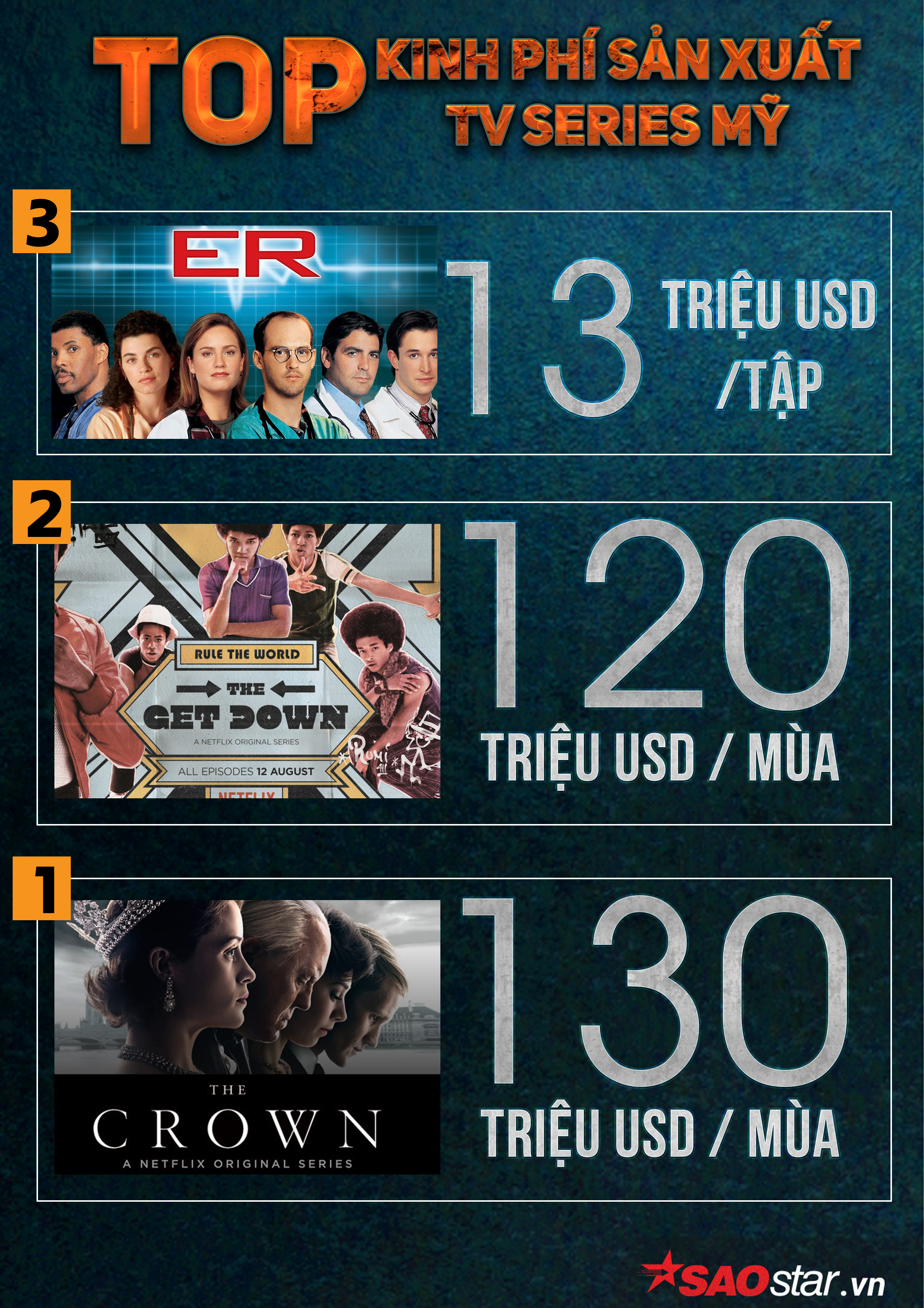 Chẳng có gì ngạc nhiên khi Netflix lại “chịu chơi” với bộ phim này. Bộ phim lịch sử The Crown kế thừa người tiền nhiệm The Queen (2006) - bộ phim sở hữu mức kinh phí chỉ 15 triệu USD. Các phục trang trong The Crown được chăm chút kỹ lưỡng, đặt hàng thiết kế riêng, gây ấn tượng mạnh với khán giả. Mùa 2 của phim sẽ chính thức khởi chiếu vào cuối năm nay.
