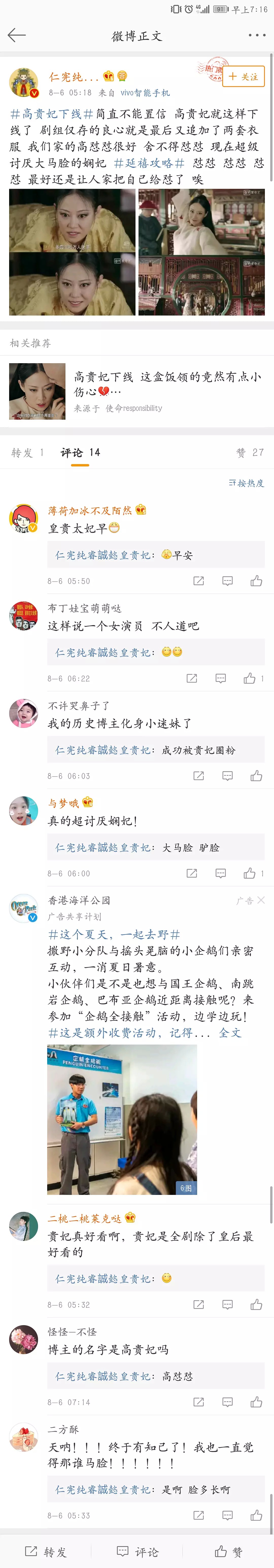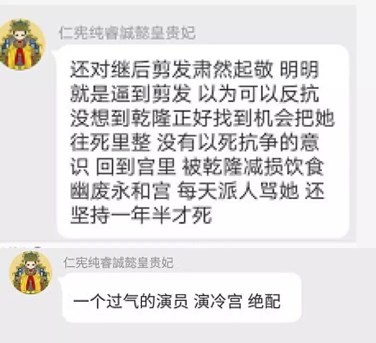 Vị cố vấn này hôm nay công kích chỉ trích Xa Thi Mạn nhưng ngược lại lại hết lời khen ngợi Cao quý phi (Đàm Trác): “Cao quý phi của nhà chúng ta lúc tức giận rất tốt, không nỡ ghét bỏ cô ấy. Bây giờ vô cùng ghét Nhàn phi…”. “Vẫn là sự cắt giảm khiếp sợ đối với Kế hoàng hậu, rõ ràng là bị ép đến cắt giảm, vốn cứ tưởng rằng có thể phản kháng lại nhưng lại không ngờ bị Càn Long tìm được cơ hội tốt bị cấm túc cho đến chết…. Còn bị Càn Long phế ngôi Hoàng hậu, cắt giảm lương thực và bị nhốt ở Vĩnh Hòa Cung, ngày ngày con cho người đến mắng chửi. Nhưng còn người này vẫn kiên trì đến hơn một năm mới chết”. - “Một diễn viên quá khí” ( đã qua thời kỳ nổi tiếng của một diễn viên), rất thích hợp để diễn lãnh cung”.