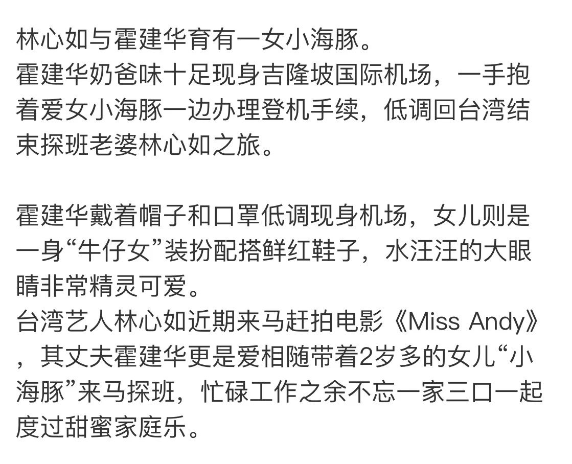 Gần đây, Lâm Tâm Như đến Malaysia quay phim, Hoắc Kiến Hoa dẫn theo con gái đến thăm mẹ. Một nhà ba người hạnh phúc tại sân bay, dân mạng chụp được những hình ảnh về gia đình Hoa Như và lan truyền trên mạng.