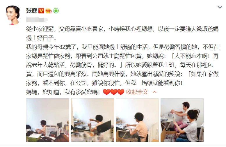 Sáng hôm nay (14.06), Trương Đình đăng những bức ảnh về người mẹ 82 tuổi của mình, có thể thấy rõ bà đang mang kính lão, chăm chú đóng gói, làm việc. Mặc dù con gái sở hữu khối tài sản khổng lồ thế nhưng bà vẫn không bỏ được thói quen cũ, không an tâm nghỉ ngơi hưởng phúc từ con.