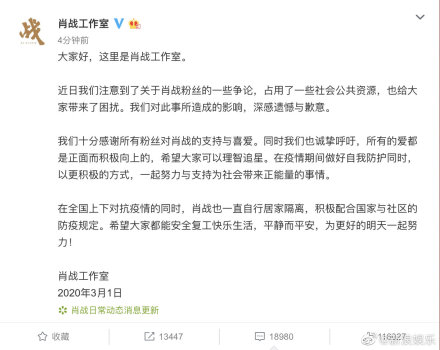 Gần đây, chúng tôi chú ý thấy được một số tranh luận liên quan đến fan hâm mộ Tiêu Chiến, đã chiếm dụng một số tài nguyên công cộng xã hội (bài đăng trên các trang mạng) cũng như mang đến rắc rối cho mọi người. Chúng tôi cảm thấy hối tiếc cũng như xin lỗi sâu sắc với những ảnh hưởng mà chuyện này tạo thành.