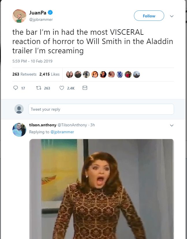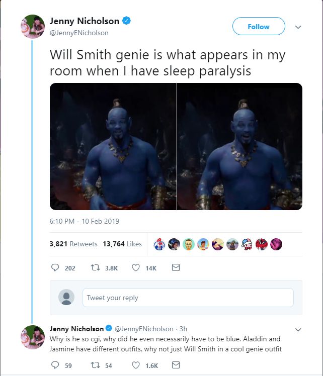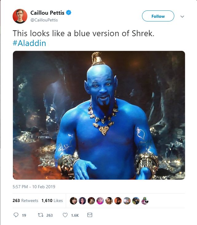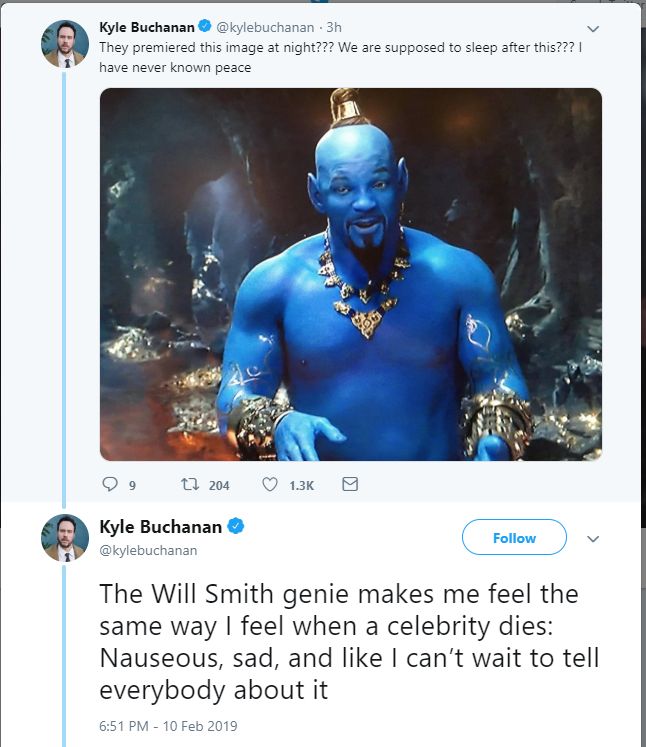 Thế nhưng, dù nhà sản xuất đã cố gắng hết sức để hình ảnh Thần Đèn trong phiên bản live-action giống phiên bản truyện tranh, những hình ảnh của Will Smith trong đoạn giới thiệu vẫn nhận được rất nhiều ý kiến trái chiều từ người hâm mộ. Họ nói: