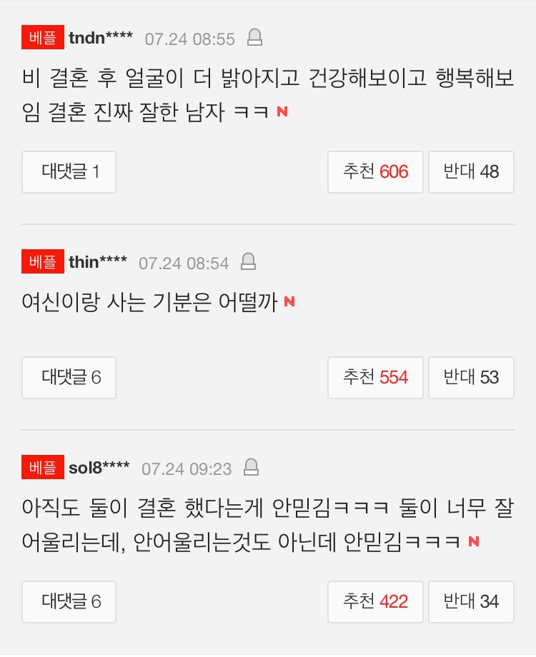 1. [+606, -48] Rain chỉ trông toả sáng hơn, khoẻ mạnh hơn và hạnh phúc hơn sau khi kết hôn. Anh ấy thực sự kết hôn tốt đấy ㅋㅋ
