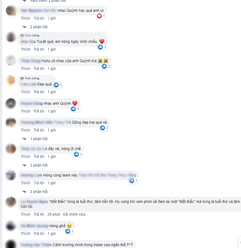 Chỉ mới trailer đầu tiên mà khán giả đã không thể từ chối trước sự cám dỗ của Mắt biếc bởi đạo diễn Victor Vũ. Với những hình ảnh đẹp như mơ, âm nhạc tuyệt vời và sự chỉ đạo của một vị đạo diễn chắc tay, giờ đây người hâm mộ chỉ còn chờ đợi vào diễn xuất của hai nhân vật chính Trần Nghĩa - Trúc Anh có thực sự “làm lên chuyện”. Phim Mắt biếc khởi chiếu vào dịp Noel 2019.