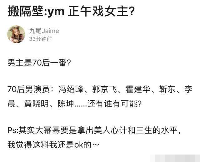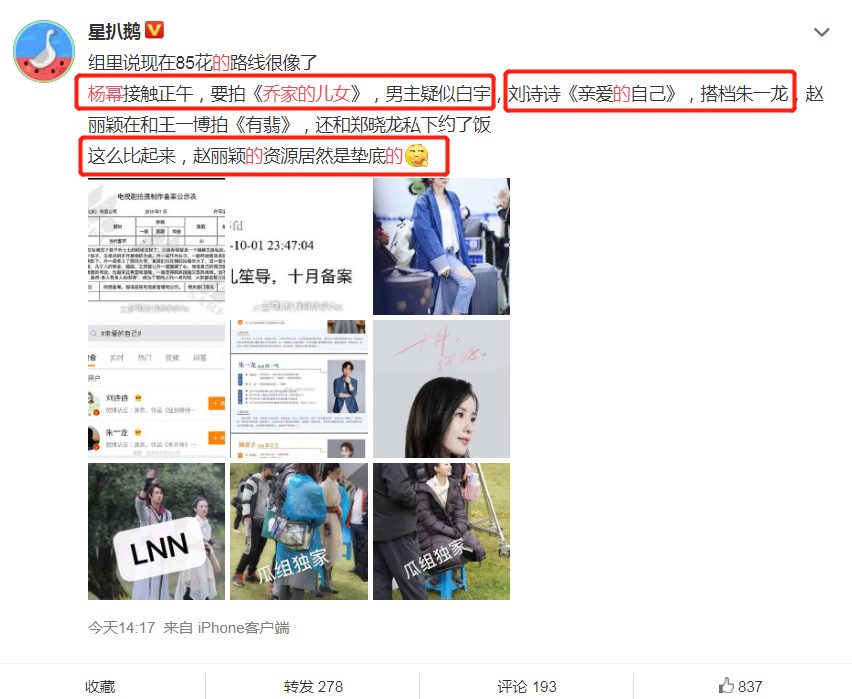 Một nguồn tin còn tiết lộ rằng, hiện tại Dương Mịch, Lưu Thi Thi và Triệu Lệ Dĩnh đều đang nắm trong tay những dự án phim lớn. Theo đó, một nhà phê bình phim nhận xét rằng: “Con đường của các hoa đán sau năm 85 rất giống nhau, Dương Mịch tiếp cận Chính Ngọ với dự án phim Trai gái nhà Kiều gia, nam chính hình như là Bạch Vũ. Lưu Thi Thi nhận phim Tôi thân thương (亲爱的自己) hợp tác cùng Chu Nhất Long, còn Triệu Lệ Dĩnh nhận Hữu Phỉ (有翡) hợp tác cùng Vương Nhất Bác rồi ăn cơm cùng Trịnh Hiểu Long…”