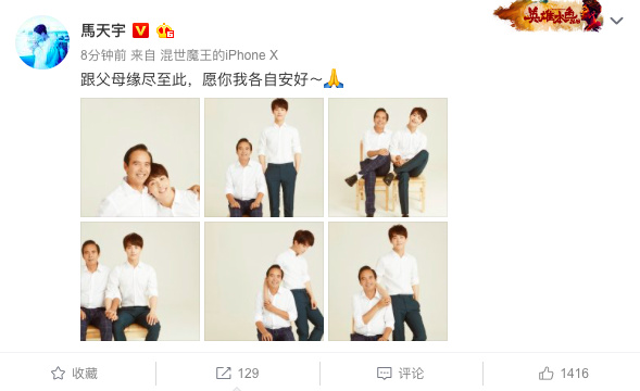 Vào buổi chiều ngày 24 tháng 5, Mã Thiên Vũ đã công bố một loạt hình ảnh chụp cùng với cha trên mạng xã hội Weibo và đăng kèm với dòng trạng thái: “Duyên phận với cha đến đây đã tận, nguyện cha và con đều sẽ tốt đẹp”. Thế nhưng ngay sau đó Mã Thiên Vũ liền xóa đi bài viết này, và một số dân cư mạng không hiểu chuyện đã bắt đầu công kích, chỉ trích anh, cho rằng anh đang tạo đề tài cho chính mình.