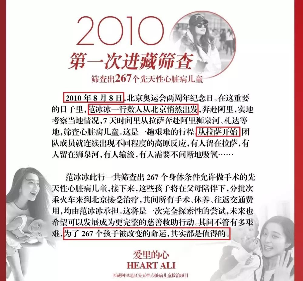 Năm 2010, Phạm Băng Băng cùng một người bạn bắt tay mở ra một quỹ từ thiện mang tên Trái tim Ali nhằm cứu giúp, chữa bệnh tim miễn phí cho trẻ em khó khăn, không có điều kiện để chữa trị, đặc biệt là ở Tây Tạng. Tròn 10 năm, quỹ Trái tim Ali đã cứu sống hơn 267 trẻ em mắc bệnh tim bẩm sinh. Nữ diễn viên đã hứa mỗi năm cô sẽ dành thời gian đến tận Tây Tạng hay những nơi gặp nhiều khó khăn để làm từ thiện công ích. Suốt những năm qua, Phạm Băng Băng luôn thực hiện được lời hứa của mình.