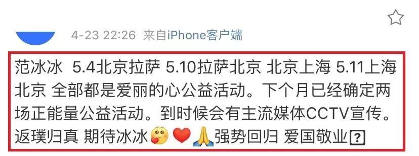 Ngày 23/04, một tài khoản đăng bài tiết lộ lịch trình tháng 5 của Phạm Gia. Theo đó, ngày 04/05 nữ diễn viên sẽ theo quỹ Trái tim Ali xuất phát từ Bắc Kinh đến Lhasa (Thành Quan, Tây Tạng) để làm công ích. Sau đó 6 ngày, tức là 10/05, Phạm Băng Băng sẽ trở về Bắc Kinh, cùng ngày cô sẽ tiếp tục theo đoàn đến Thượng Hải quan sát, lắng nghe tình hình khám chữa bệnh của trẻ em Tây Tạng tại bệnh viện.