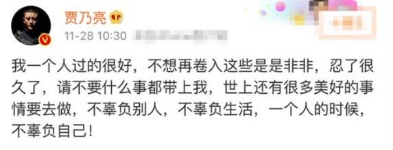 Ngoài sự thay đổi về phong cách hình tượng, Giả Nãi Lượng cũng từng có những dòng chia sẻ bằng chính tài khoản cá nhân của mình trên mạng xã hội, nam diễn viên bày tỏ rằng mình hiện tại chỉ có một mình, và cuộc sống vẫn rất tốt, không muốn tiếp tục bị kéo vào những chuyện thị phi kia… Dân mạng cho rằng, những dòng chia sẻ này dường như biểu thị rằng Giả Nai Lượng và Lý Tiểu Lộ đã ly hôn.