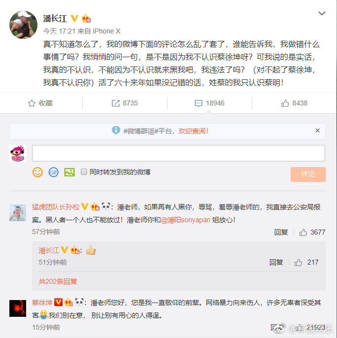 Phan Trường Giang cũng đã đăng lên Weibo bày tỏ việc ông thật sự không nhận ra Thái Từ Khôn nhưng có nhiều người lại vì chuyện này mà hắc mình. Thái Từ Khôn sau đó đã bình luận trên bài đăng của ông: “Phan lão sư, chào thầy. Thầy là một vị tiền bối mà em vẫn luôn ngưỡng mộ. Bạo lực mạng vẫn luôn làm tổn thương người khác và có nhiều người vô tội phải chịu đựng điều đó. Chúng ta cũng đừng để tâm đến nữa, đừng để những người có tâm cơ đạt được mục đích”.